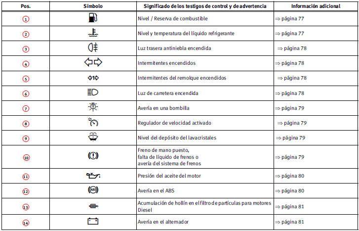 Cuadro general de los testigos de control y de advertencia