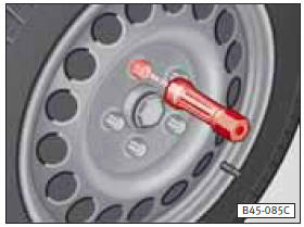 Quitar el embellecedor central1) con la llave de rueda y el gancho de alambre*. Colocar el gancho de alambre en los dos agujeros del emblema SEAT. Pasar la llave de rueda a través del gancho y retirar el embellecedor. Véase la figura.