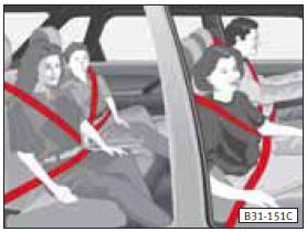 - Para obtener la máxima eficacia protectora de los cinturones se debe ir sentado correctamente; véase también el capítulo “Asientos delanteros”.