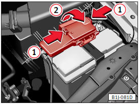 - Empuje las dos lengüetas en el sentido de la flecha 1 y abra hacia un lado la tapa del portafusibles (flecha 2).