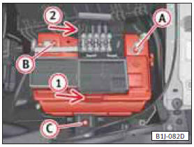 - Desenganche primero la chapa de sujeción delantera (flecha 1) y, a continuación, la trasera (flecha 2) de la batería. Para ello tendrá que separar un poco las chapas de la batería.
